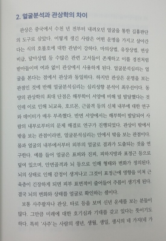 책에서 정의하고 있는 얼굴 분석의 내용이다. 같이 얼굴을 본다는 관점은 동일하지만 동양의 관상학이 사람의 운명을 보는 관점인 것에 반해 얼굴 분석은 심리 성향 분석에 우선을 두고 있다는 차이점이 있다. 이는 해부학이 예전부터 발달하여 사람 내부에 대한 연구가 많이 이루어졌던 부분과도 연관이 있다 할 수 있겠다.