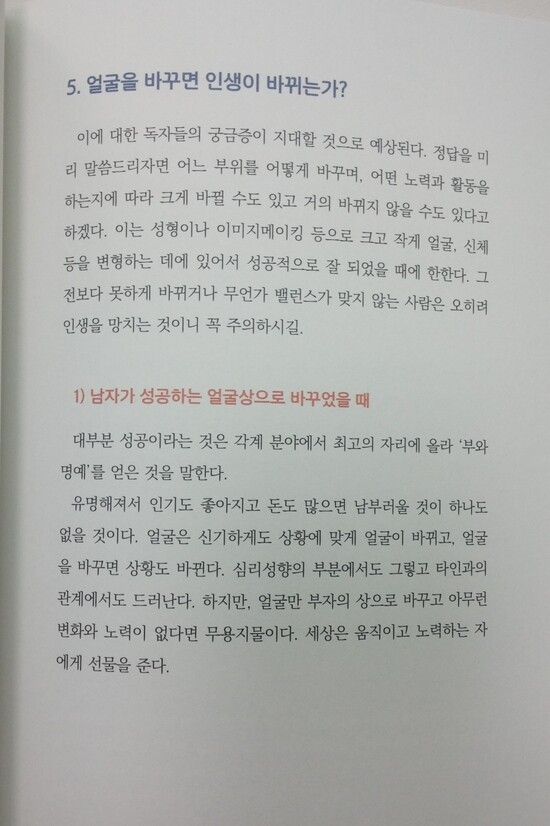 "어느 부위를 어떻게 바꾸며, 어떤 노력과 활동을 하는지에 따라 크게 바뀔 수도 있고 거의 바뀌지 않을 수도 있다고 하겠다. 이는 성형이나 이미지메이킹 등으로 크고 작게 얼굴, 신체 등을 변형하는 데에 있어서 성공적으로 잘 되었을 때에 한한다. 그전보다 못하게 바뀌거나 무언가 밸런스가 맞지 않는 사람은 오히려 인생을 망치는 것이니 꼭 주의하시길"