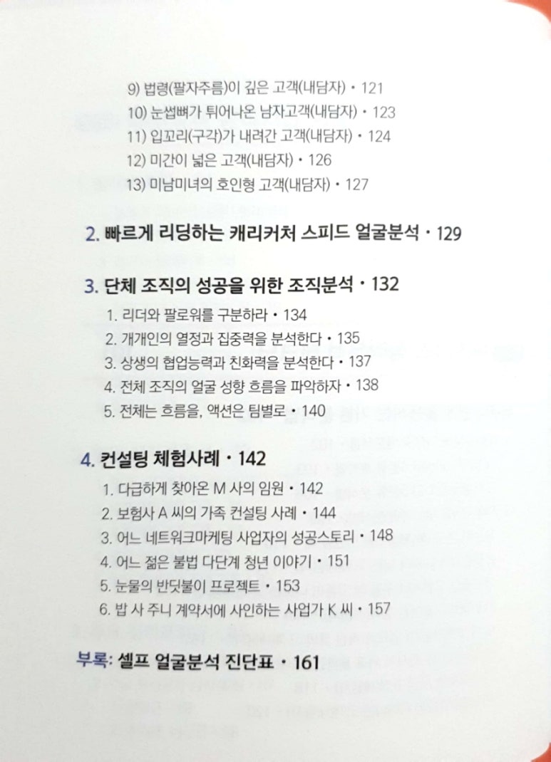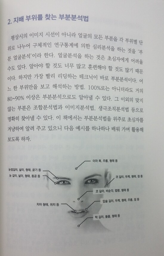 이 책은 5단계 얼굴 분석법 중에서 1단계의 초보적인 내용을 다루고 있다고 한다. 2단계는 황금 공식에 의해 연관된 여러 부위를 조합하여 분석하는 법, 3단계는 선천적인 부위와 후천적인 부위의 조합분석법, 4단계는 이미지메이킹과 함께 상생상극의 컬러나 의상 또는 액세서리 등을 조합하여 분석하는 법, 마지막 5단계는 가족이나 조직 또는 회사나 국가의 전체 흐름을 읽어 내는 거시적 조직분석법을 다루고 있다.