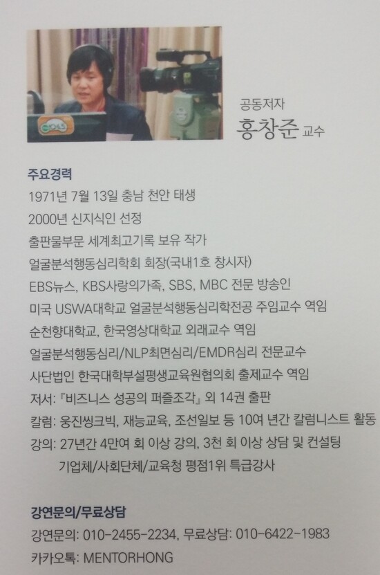 단 10초 만에 고객의 심리를 간파 비즈니스 얼굴분석심리 안녕하세요. 그림책 비전멘토 박상림입니다. 단 10초 만에 상대방의 심리를 간파할 수 있다면 어떠실 것 같아요? 사람은 누구나 관계를 맺고 살아갑니다. 나에게 이익을 줄 사람, 손실을 줄 사람을 나도 모르는 사이에 판단을 하고 있습니다. 단 10초 만에 고객의 심리를 간파해서 고객의 니즈를 채워준다면 당연히 비즈니스에서 성공할 수 있겠지요. 얼굴분석행동심리학의 창시자 홍창준 교수가 동양과 서양의 얼굴 관련 논문, 연구 자료 등과 학회 자료를 총망라하여 '얼굴분석행동심리학'의 처세로 집대성한 책이 있어 소개합니다. <<비즈니스 얼굴분석심리>> 홍창준 작가는 1971년 충남 천안 태생으로 다양한 기록과 경력을 가지고 있으며, 그 중심에 어린이를 향한 마음의 진심이 담겨져 있다. 20년 이상 유아와 초등학생 사이에서 현장 경험을 쌓고 대학교와 사회단체에서 강의를 한 교수이기도 하다. MBC [똑똑키즈스쿨]에서 엄지맨으로 고정출연하며 방송인의 입지를 굳혔으며, SBS [우리아이가 달라졌어요], EBS 생방송 [부모], EBS 뉴스, MBC 뉴스데스크, KBS [TV유치원], KBS [사랑의 가족] 등 수많은 어린이 관련 방송 프로에서 활약했다.