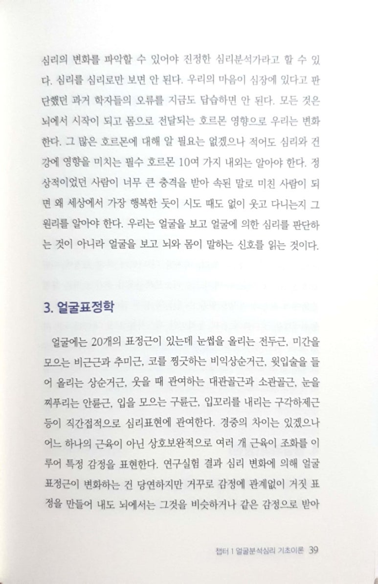 p18 요즘 MBTI가 유행이라 아이와 재미삼아 심리유형검사를 해 본 적이 있지만 이렇게 통계적이고 체계적인 얼굴분석행동심리학이 있는 줄은 몰랐어요. 있는 그대로의 얼굴과 이미지, 행동 등을 보고 분석하여 심리상황과 근골격게, 내분비계, 뇌 상태, 건강상태, 다중지능, 길흉따위를 그것이 즉시 알아낼 수 있는 심리분석 도구인 셈이에요. 과연 가능할까? 반신반의하면서 완독하게 되었어요.