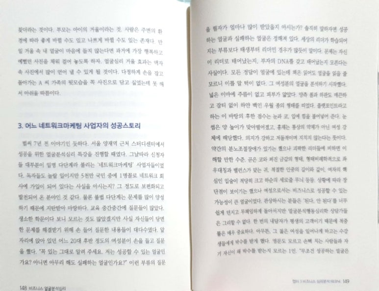 역시 상대의 심리를 간파하는데 많은 노력이 필요합니다. 책에서 배우는 비즈니스 얼굴분석심리는 얼굴분석행동심리학의 한 과목에 불과하지만 잘 알아두면 여러 모로 유익한 이론입니다. 뒷부분은 얼굴분석심리를 어떻게 활용하는지 사례를 통해 이해할 수 있습니다. 저는 이제부터 행복을 부르는 표정근을 자주 사용해보렵니다.