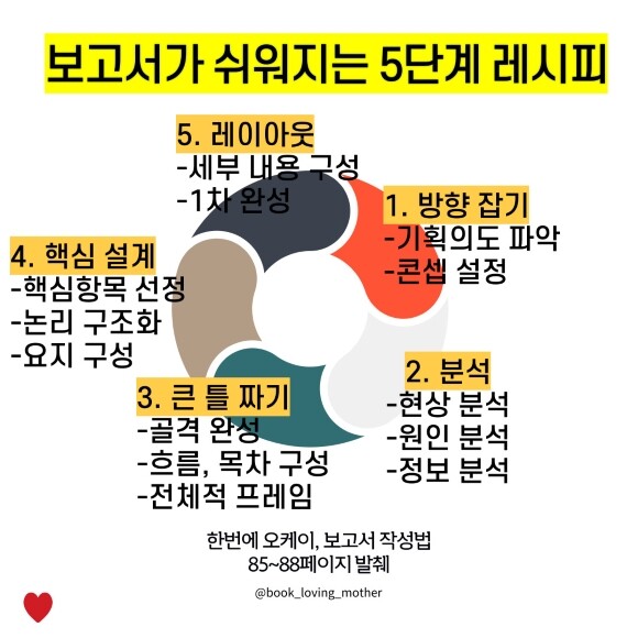 또한, 보고서를 바꾸는 제거의 미학이 중요합니다. -익숙한 방식을 제거하라. -자료는 많을수록 좋다는 생각을 버려라. -완벽하게 쓰려는 마음을 버려라. 한번에 오케이! 보고서 작성법 57~60페이지 발췌 보고서가 쉬어지는 5단계 레시피가 있어요.
