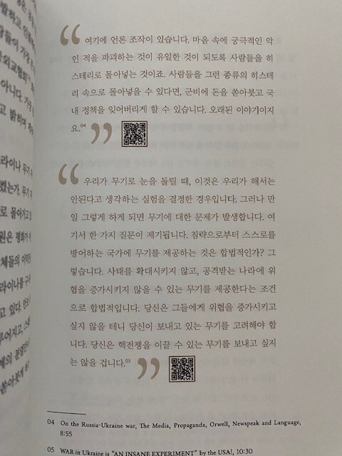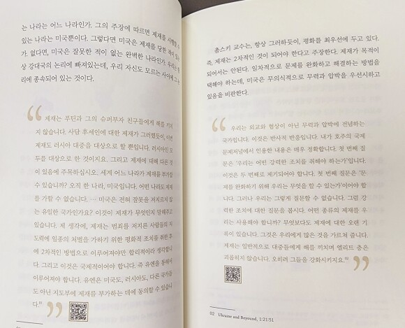 그동안은 러시아와 우크라이나의 관계에 대해 단편적인 정보만을 접했다면, 책에서는 당사 국가뿐만 아니라 미국이나 중국과 같은 나라들까지 포함하여 우크라이나 사태가 어떤 영향을 주고 각 나라 간의 관계가 어떻게 연결되어 있는지 알 수 있어서 좋았다. 그중에서도 미국은 러시아를 처벌할 생각만 하지 말고, 단 한 사람의 우크라이나인이라도 구하라는 내용이 무척 흥미롭게 다가왔다.