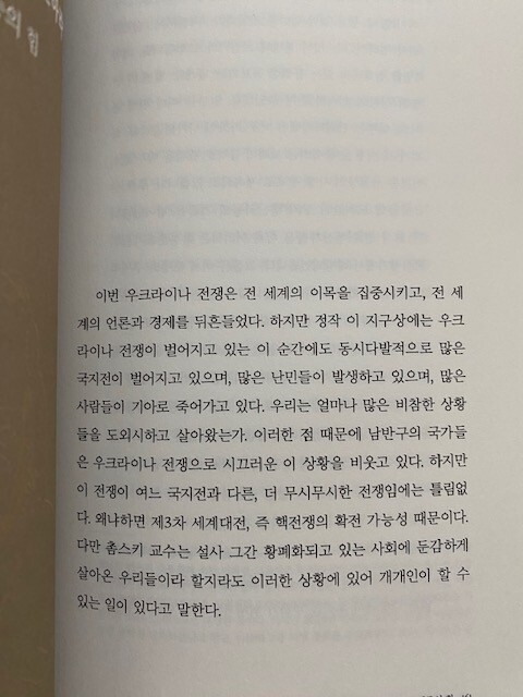 그동안 왜곡되고 편향된 시각에서 보도된 뉴스나 기사들로 우크라이나 사태에 대한 정보를 받았지만, 이 책을 통해 세계적인 석학이자 운동가인 촘스키 교수의 견해를 들을 수 있어 우크라이나 사태에 대한 정확한 파악뿐만 아니라 더 나아가 우리가 할 수 있는 일은 무엇이 있을지에 대해 생각해 보는 시간이었다.