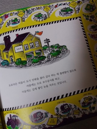 | 우선 자동차를 좋아하는 아이에게 권할만 한데, 단순히 차만 나와 있는 그림이 아니라 움직이는 순서대로 나눠서 트랙터의 모습을 조그맣게 그리고 있어 차가 일하는 과정을 알 수 있다는 장점이 있습니다. 차가 어떻게 움직이고, 일하는 과정이 어떻게 되는 지를 그림을 보면서 자연스럽게 알게 되는 거죠. 처음에는 그림이 작고 거칠어서 별로라고 생각이 들 수도 있지만, 제가 어렸을 때 이런 그림을 좋아했던 기억이 어렴풋이 나서 아이도 좋아할 거라고 생각했는데, 역시 좋아했어요. 도시의 여러가지 시설을 함께 배울 수 있는 책이라 아주 어린 아이부터 조금 큰 아이까지 활용도가 넓은 책입니다. |