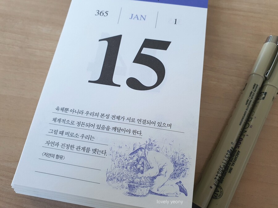 사실 12월은 되어야 받을 수 있을 줄 알았는데 일찍 도착해서 선물을 받은 느낌입니다. 1년 365일 일력으로 되어있는데 요일 없이 일월만 적혀있어서 다음해에도 쓸 수 있게 되어 있어요. 데스크에 놓기에 크기도 딱 적당하고 날짜도 크게 보이고 디자인 적으로도 마음에 들어요. 매일 매일 한 장씩 넘겨서 아침마다 읽는데 어떤 책에서 발췌했는지 나와 있어서 좋아요. 하루 한 문장씩 필사해보려고 합니다. |