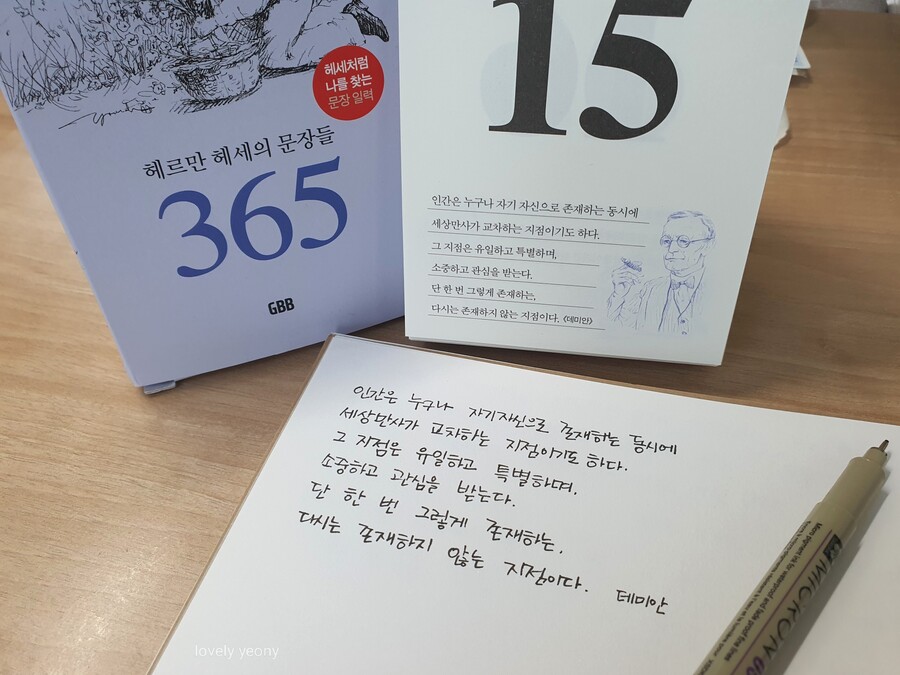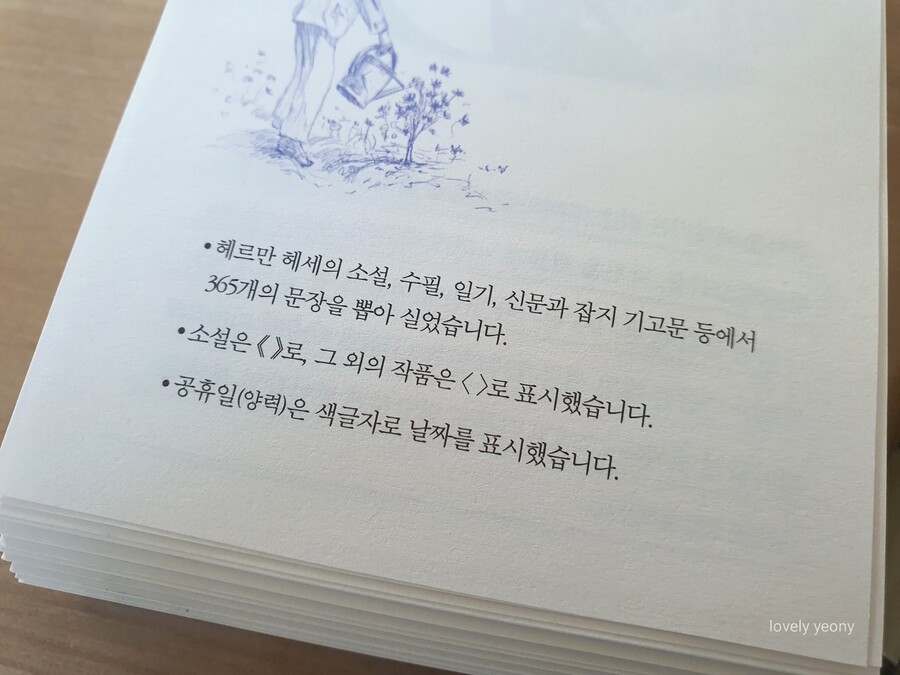 헤르만 헤세의 문장들 365[만년 일력] 좋은 글로 시작하기를 하고 싶어 구매했다. 필사 관련된 여러 책이 있지만, 헤르만 헤세의 책으로 픽! 헤르만 헤세의 책도 종류가 다양해 몇가지 책 중에 고르고 고르다가 가족이 모두 함께 볼 수 있어 좋고, 만년 일력이라 짧은 내용으로, 아이도 함께 읽기에 부담없고, 필사하기에도 내용이 간단 명료해 좋다. 좋은건 가족이 함께하기~ 헤르만 헤세의 문장들 365 매일 나를 찾는 문장 일력 헤르만 헤세의 소설과 잡지 기고문, 수필, 일기까지 다양한 글에서 좋은 문장만 골라 담았다. 몰랐던 문장과 글들을 알아가는 재미도 크다! 날짜는 1월 1일부터 (양력기준) 7월 1일부터는 뒷면으로 넘겨 사용하면 된다. 글 옆에 그림이 있어 궁금했는데, 헤세의 모습을 담았다고 한다. 연필 드로잉 일러스트로 담은 헤르만 헤세의 모습을 함께 감상할 수 있다. 작은 일력에 소소하게 담은 일러스트까지 감상하는 재미가 여유를 더해준다. 기존에 헤르만 헤세의 데미안을 구매해 읽었는데 이 책에서 만난 데미안의 문장들은, 내가 데미안을 읽으며 느꼈던 것과는 또 달라 반갑고 새로웠다. 헤르만 헤세의 다양한 책을 알아가는 재미도 있다. 살면서 모든 책을 읽기 어렵겠지만 부담 없이 시작기 좋은 일력으로 먼저 시작해보시길! 좋은 글은 헤르만 헤세의 만년 일력으로 먼저 만나고 관심 가는 책은 구매해 소장해도 좋겠다. 올해를 시작하며 마음이 쓰이는 일, 신경 쓰이고, 때론 슬픈 일들이 있다보니 마음이 혼란 스러웠달까 그런데 그마음을 담고 있기만 하기엔 또 쉽지 않아서 이런 마음을 위로해줄 책을 종종 찾다 보니 필사하며 좀 더 기억해야 겠다는 필요를 느꼈다. 가족과 함께 읽어 좋고, 마음의 상처를 아물게 해주고, 꾸준히 읽다보면 흉터를 연하게 해주는 책 같아 더 마음이 갔다. 이전에는 일력에 크게 관심이 없었는데 왜 읽는지 알게 되는 순간이었달까. 바쁜 일상에서 잠깐의 여유를 갖기에 좋다. 좋은 명작을 읽으며 마음을 위로하고, 필사하며 마음의 여유를 가질 수 있다. #헤르만헤세의문장들 #헤르만헤세일력 #헤세의말 #만년일력 #필사추천 |