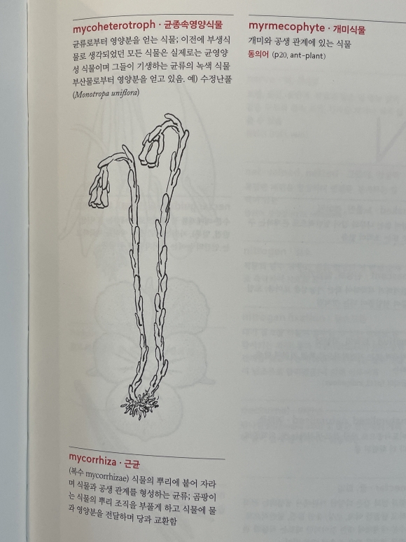 일반적으로 케주얼하게 읽은 만한 책은 아니지만, 식물학과 혹은 식물관련자격증 관련 공부(예:식물보호기사, 종자기사, 자연생태복원기사, 생불분류기사-식물 등)를 해 보시겠다 하시는 분들은 추천합니다. 동정에 관해 자세히 나왔어요! 휴대용 도감으로 많은 도움이 될겁니다. 그림은 사진이 아닌 스케치로 되어있으니 참고 하시길 바랍니다. 책 내용 중 근균(mycorrhiza) 식물의 뿌리에 붙어 자라며 식물과 공생관계를 형성하는 균류; 곰팡이는 식물의 뿌리 조직을 부풀게 하고 식물에 물과 영양분을 전달하며 당과 교환함 개미식물(myrmecophyte) 개미와 공생 관계에 있는 식물 이렇듯 자연은 연결되어 있습니다. 우리(자연)는 모두 연결되어 있는 하나의 생명이며 여럿의 생명들입니다.