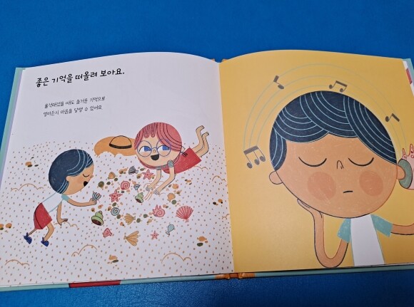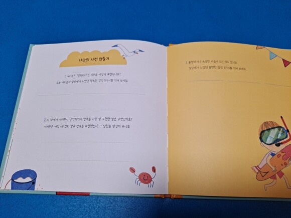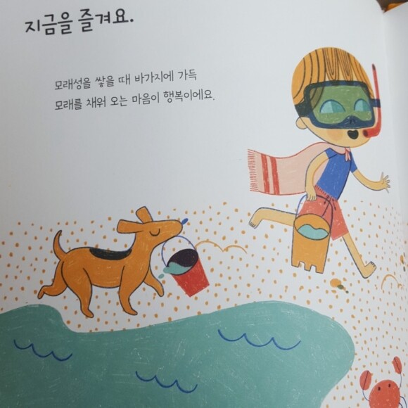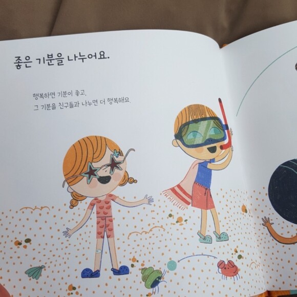 행복해요 그림책에는 모래사장에서 보내는 여름날의 하루로 다양한 상황을 통해 행복의 의미를 보여주네요. 저희 아이도 그림을 보면서 친구랑 놀때 아이스크림을 먹을 때 행복하다고 말하네요.