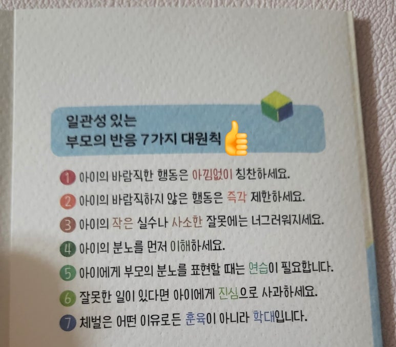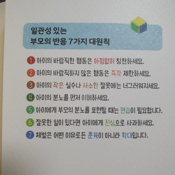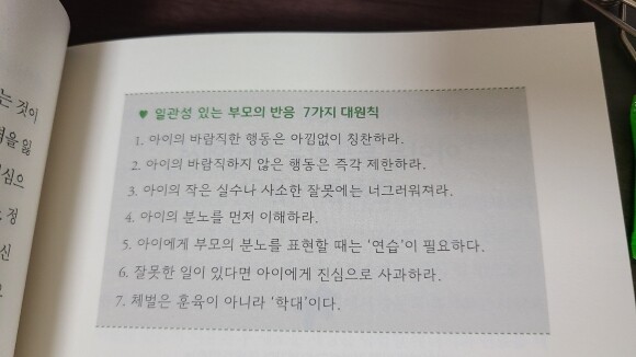 일관성 있는 부모의 반응 7가지를 배워봅니다.. 아이의 바람직한 행동에 칭찬하고.. 반대 행동은 즉각 제한하고.. 작은 실수나 사소한 잘못에는 너그럽고.. 분노를 이해하고.. 잘못한 일이 있다면 아이에게 진심으로 사과하고.. 체벌은 안되고.. 잘 기억하고 지켜야겠어요..