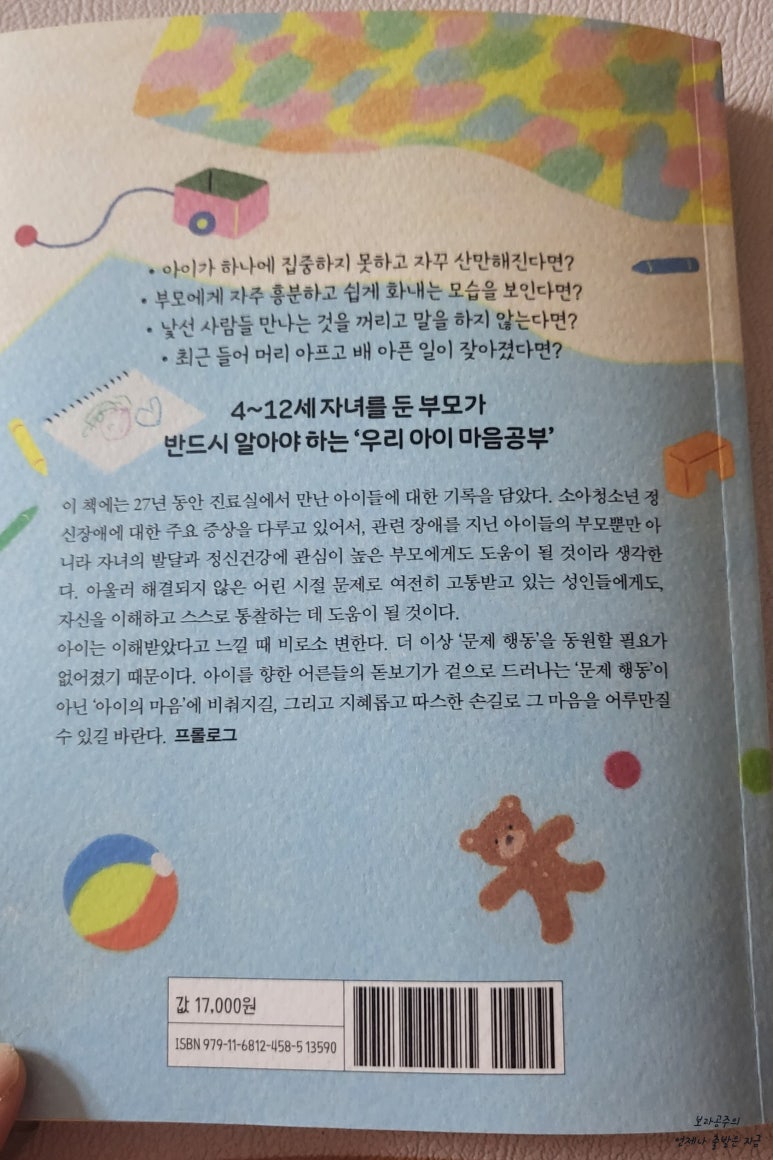 아이를 키우다 보면 도대체 어떻게 해야 하는 건가 왜 이런 문제가 자꾸 반복되는가 방향을 찾지 못해 답답하고 지칠 때가 있는데 그 때마다 찾아보게 되는 것이 이런 아이심리 관련 책이다. 이미 내 책 꽂이에도 몇 권이나 꽂혀 있는 분야이기도 하지만 천근아 선생님의 새 책이 출간되었다는 소식에 꼭 읽어보고 싶었다. 천근아 선생님은 예전에 아기 키우면서 육아 방송을 보다 알게 된 선생님인데 사실 요즘 핫하신 오박사님보다 난 천근아선생님 팬이었다 ^^ 최근에는 소아정신과에 대한 인식이 많이 달라져서 도움이 필요하다고 생각하는 부모들이 예전보다는 덜 부담스러워하며 찾아가는 것 같다. 물론 진단을 받아보았을 때 의사선생님이 이 정도는 많은 아이들이 자라면서 할 수 있는 행동이고 생각이 자라면서 스스로 교정하기도 하고 성숙하면서 사라질 행동이니 너무 걱정스럽게 생각하지 않아도 된다고 진단한다면 그야말로 부모가 좀 더 여유를 갖고 키워나가면 된다. 하지만 아직까지도 많은 부모들이 의사선생님을 찾아놓고도, 막상 치료가 필요하다 약물 처방을 함께 해주겠다 라고 병명을 명확하게 진단하면 부담감이나 거부감으로 치료를 망설이는 경우를 많이 보았다. 이 책을 읽으면서 부모를 힘들게 하는 아이들의 행동이 어느 정도일 때 전문적으로는 어떤 병명으로 진단되는지를 알게 되었고, 그럴 때는 꼭 치료가 필요하다는 것도 알게 되었다. 사고가 나서 다치거나 병에 걸려서 건강하지 못한 아이들의 치료를 망설이는 부모들은 거의 없을 것이다. 문제 행동을 하는 아이들도 삶을 편안하게 살기 힘든 아픔을 가진, 치료가 필요한 아이들이라는 생각을 한다면 부모의 체면이나 거부감보다는 아이를 위한 치료와 도움이 그리고 회복할 수 있는 기회가 얼마나 중요한지 옳은 판단을 하게 될 거라는 생각이 들었다. 각 문제 행동들마다 어느 정도면 치료가 필요한 심각성을 가진 것인지 확인해 볼 수 있는 진단기준 체크리스트가 있어서 나와 내 아이의 상황을 점검해 볼 수 있었다. 어떤 행동은 괜찮은 편에 속하기도 하고 어떤 행동은 조금 심각한 수준과 비슷해 보이는 것도 있었다. 조금 심각해 보이는 부분에서는 '지금 부모가 실천할 수 있는 일'에서 제시해 주신 부모지침을 꼼꼼하게 읽어보았다. 내가 먼저 아이를 위해 노력해야 할 부분들이 명확해지니 또 한 번 노력해 봐야 겠다는 다짐이 더 강해졌다. 그리고 일관성 있는 부모의 반응 7가지 대원칙은 매일 볼 수 있게 화장대에 써 붙여 놓았다. 선생님의 마지막 멘트를 매일 되새기며 우리 아이 잘 키우고 싶다 ㅡㅡㅡㅡㅡ 그럼에도 불구하고 아이는 잘 자랄 수 있습니다 아이들은 의외로 부모가 자신을 무조건적으로 사랑하고 있다는 사실을 저대로 알지 못한다. 아이는 자신이 '어떤 행동을 해도 버림받지 않을 것'이라는 믿음이 확고할 때 비로소 건강하게 행동한다. 아이 마음을 다 안다는 착각중에서... #아이마음을다안다는착각 #위즈덤하우스 #천근아