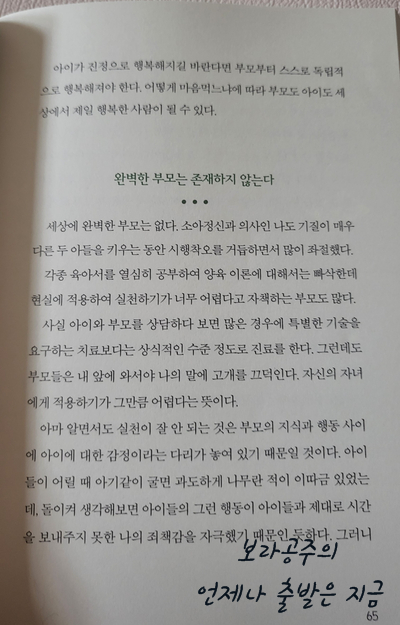 초반의 문장들에서 마음을 뜨겁게 울리는 느낌을 받았다. 우리 아이들이 그러지 않았을까? 우리 아이들이 힘들지 않았을까? 아이들한테 이런 게 필요했던 거였구나! 아이들의 표정, 말, 그리고 외면했던 내 모습들이 떠올라 마음이 아팠다. 아이의 신호를 알아채지 못했던 엄마여서 미안했다. 아이의 간절히 원하던 그 한마디와 눈빛을 주는데 그다지 많은 시간이 필요했던 게 아니었는데 그러지 못해 후회스러웠다. 아이의 입장에서 그 마음을 이해해 보기, 아이에게 '사랑한다'는 그 한마디 하기, 아이의 재잘대는 그 말을 들으려는 여유를 가져보기 등을 다짐했다. 그리고 문장 하나하나를 마음에 담아 가며 읽고 또 읽었다.
