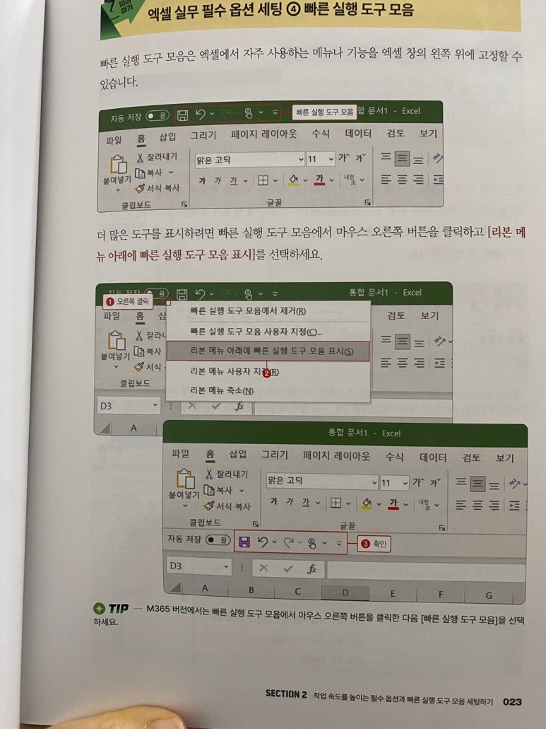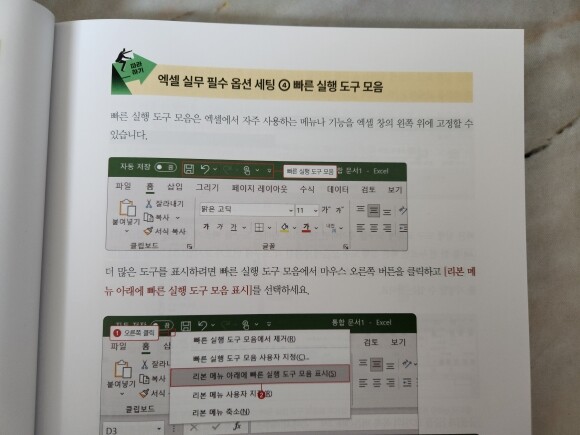 첫 장에는 엑셀은 결코 어려운 프로그램이 아니라고 설득하며서 시작하고 있습니다. 사실 엑셀, 데이터베이스 이런 이름만 들어도 거부감이 느껴지는 건 많은 직장인들이 과정은 모르는데 결괏값을 빨리 도출해야 되는 상황에 처해있기 때문은 아닐까요? 실무에 꼭 필요하지만 정작 실무에서 하나하나 수식을 짚어가며 가르쳐 줄 사람은 없으니까요. 그래서 시작은 엑셀프로그램 화면을 세팅하는 것부터 시작합니다. 자주 쓰는 기능을 즐겨찾기처럼 추가하고, 입력 방식 등을 세팅해 마치 잘 정리된 책상처럼 만들어 놓는 과정부터 시작합니다. 깨끗하게 정돈된 책상에서 일해야 업무능력이 오르는 것처럼 컴퓨터 프로그램도 업무에 맞게 셋업 하는 과정이 중요하거든요. 매일 해야 하는 과정이 아니라 한번 설정해 두면 계속 사용할 수 있기 때문에 이런 과정은 꼭 필요한 것 같아요.