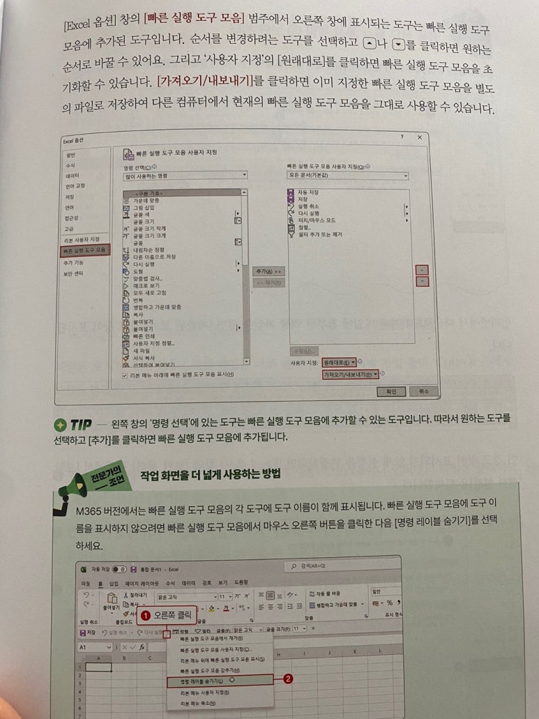 엑셀 강의를 들으면 모든 강사가 하나같이 똑같이 말하는 내용이 있다. 그게 바로 빠른 실행 도구 모음을 세팅하는것이다. 본인에게 맞는 빠른 실행 도구 모음으로 업무 시간을 단축할 수 있는데 특히 수식만 붙여넣는 것을 빠른 실행도구모음에 넣어두면 표 모양은 그대로 둔 채 붙여넣기가 가능하다. 저자는 작업속도를 높이기 위해서는 필수 옵션을 세팅하고 빠른 실행 도구 모음을 세팅하는 방법을 책의 서두에 소개하고 있다.