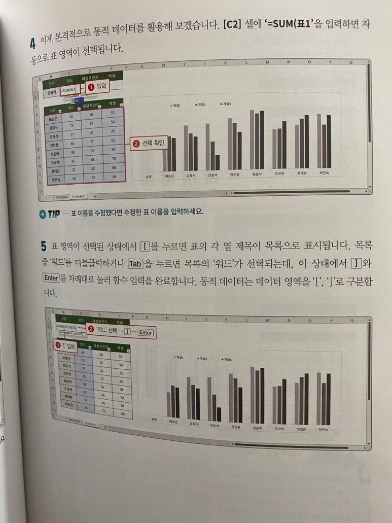 몇가지 기억에 남는 유용한 팁을 소개하자면 데이터 표시형식에서 수식을 사용하려면 숫자 그대로 둬야하는데 #나 0을 사용하는 방법을 소개하고 있다. 또 응용하자면 1월,2월 이런 것들을 서식만 #월이라고 해놓으면 1월,2월 이런식으로 쓸 수가 있다. 엑셀을 쓰면서 참조가 엄청 헷갈렸었는데 책에서는 참조에 대해서 쉽게 설명하고 있다. 가장 신기했던 건 동적데이터화였는데 표이름을 정하고 그 안에 숫자가 바뀌거나 추가되더라도 표안의 값을 그대로 수식으로 계산한다는 것이었다. 이는 책보고 따라해본 후, 놀라움을 금치못했다.