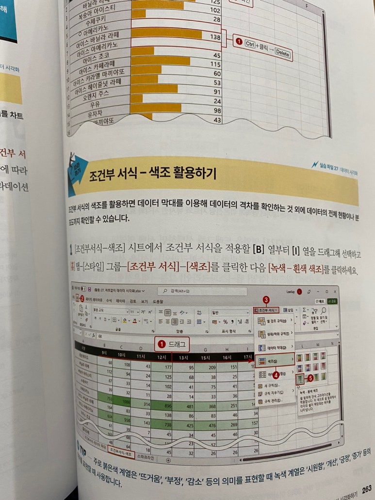 앞쪽보다는 뒤로 갈수록 실무와 접목되는 게 커서 더 와닿는 부분이 있다. 그래도 앞 쪽 부분을 읽으면서 아! 아! 내가 간과하고 있었던 부분이 많았구나 싶었던 부분도 있었다. 조건부서식이나 피벗테이블 활용을 쓸 일이 더 많아서 따로 표기해두었다. 이렇게 조건부 서식을 이용하면 차트없이도 표의 최대값, 최소값 등을 한눈에 보기가 쉽다.