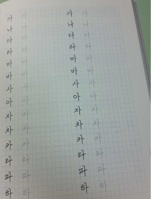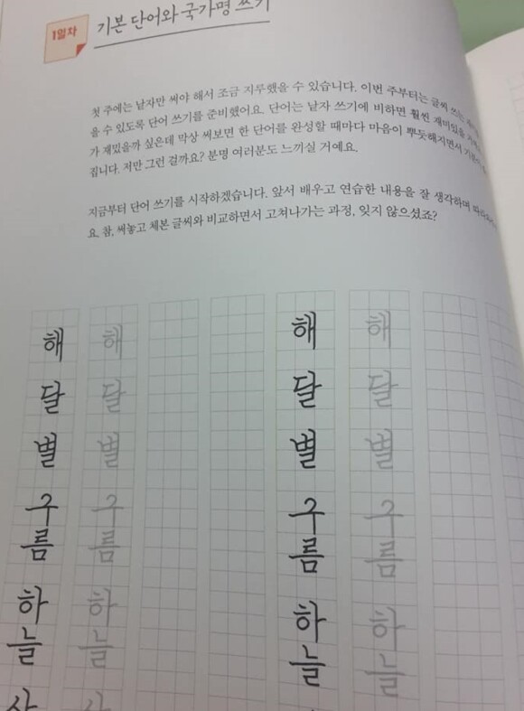 오른쪽 페이지 에는 글자를 따라 쓸수 있는 공간이 있으며,바르게 쓰면 좋을 것 같습니다.
