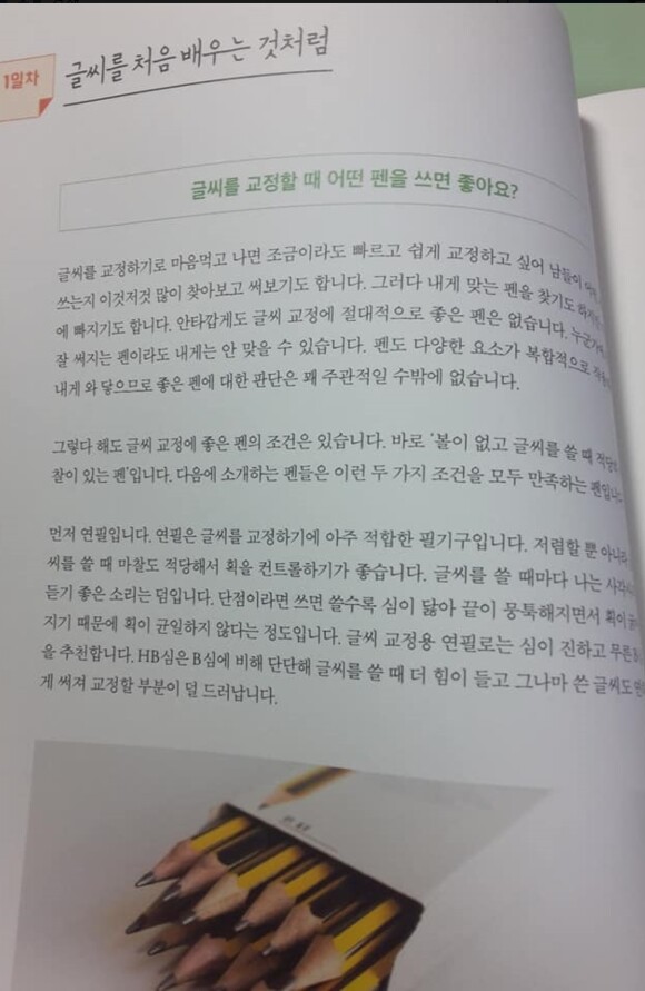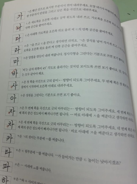 글씨를 교정 할때, 어떤 펜이 좋을지 ,가 나,다, 라 글자를 잘 쓴법을 설명 하고 있습니다.