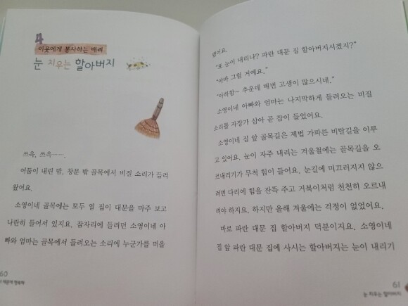 어른을 공경하는 배려뿐 아니라 침묵의 문 이야기도, 알림장 이야기도, 골목길 눈 치우는 이야기도, 함께 살아가는 사회에서 서로를 생각하며 돕는 배려의 마음을 보여준다.