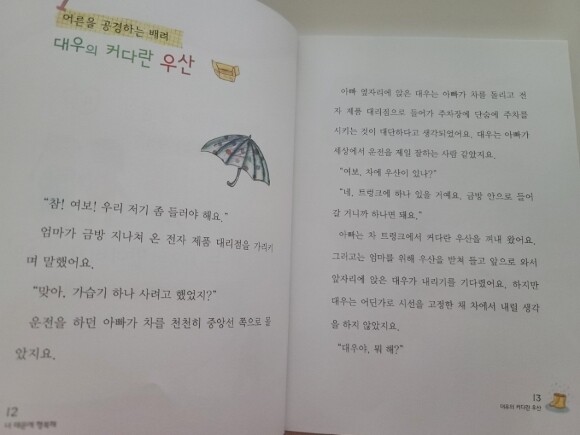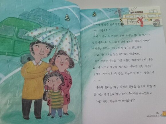 첫번째 이야기 대우의 커다란 우산부터 따뜻한 마음이 모락모락 피어나는 이야기였어요. 아빠, 엄마와 함께 가습기를 사러 전자 제품 대리점으로 차를 타고 가는 대우. 비가 내리는 날이라 커다란 우산을 다같이 쓰고 전자 제품 대리점으로 들어가요. 성능이 다양한 제품들에 엄마, 아빠는 매장 직원이 설명을 듣다가 대우가 사라진걸 알아채죠. 아빠와 엄마는 가습기 고르던 일은 제쳐 두고 대우를 찾아 매장 밖으로 뛰어나갑니다. 엄마는 주차장 한쪽 구석에서 대우를 발견하고 거기서 뭐하냐며 다그치지만 알고보니, 대우는 폐지 줍는 할아버지가 비를 맞고 계서 우산을 받쳐 들고 있었던 거였어요. 남을 배려하는 마음씨에 감동했던 이야기였답니다.
