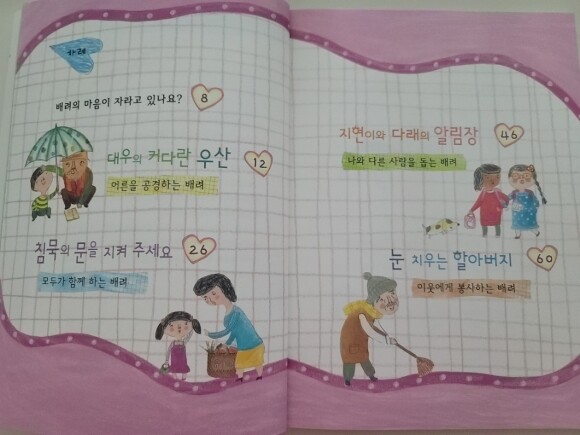 대우의 커다란 우산 어른을 공경하는 배려 침묵의 문을 지켜 주세요 모두가 함께 하는 배려 지현이와 다래의 알림장 나와 다른 사람을 돕는 배려 눈 치우는 할아버지 이웃에게 봉사하는 배려 네 편의 동화 속에 등장하는 작은 행동들 하나하나가 모두 배려라는 것을 배우고 나면 그 개념이 조금 더 가깝고 친근하게 느껴진다는 것이 매우 의미있는 것 같습니다.