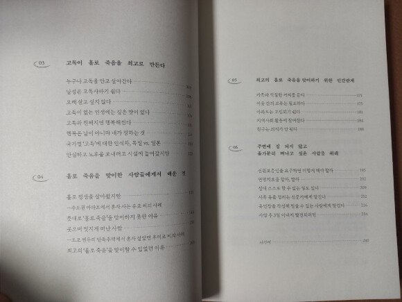 1장 ‘홀로 죽음의 시대가 왔다’ 2장 ‘홀로 죽음을 맞이하는 행복’ 3장 ‘고독이 홀로 죽음을 최고로 만든다 4장 ‘홀로 죽음을 맞이한 사람들에게서 배운 것 5장 ‘최고의 홀로 죽음을 맞이하기 위한 인간관계 6장 ‘주변에 짐 되지 않고 홀가분히 떠나고 싶은 사람을 위해