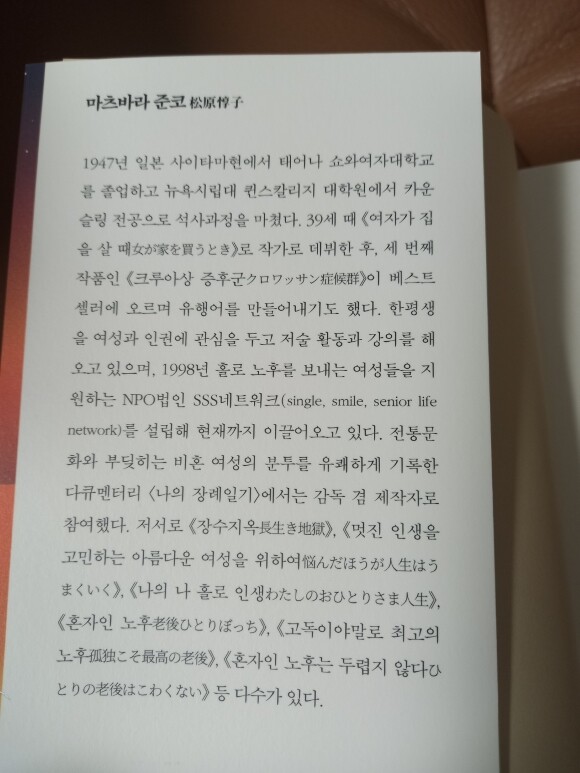 저자가 이끌고 있는 홀로 노후를 보내는 여성 비영리단체 SSS네트워크에서 겪은 일화, 특히 고독사에 관한 내용을 읽으면서 나름 씁쓸하였다. 마음 속으로는 부인하고 싶었지만 너무 현실적으로 와닿았기 때문이다.