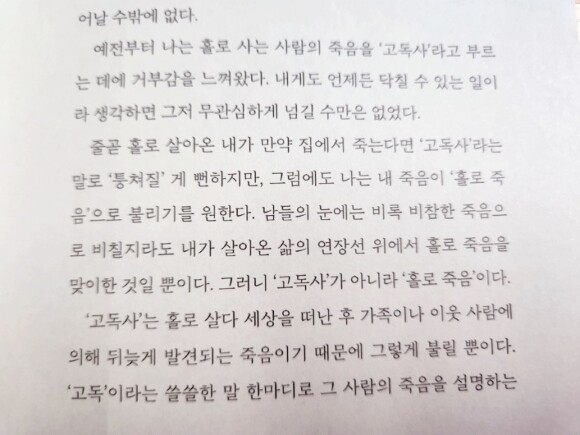 뉴스를 보면 홀로 죽음을 맞이한 사람이 한참 후에 발견되는 경우를 자주 접하게 된다. 이름하여 '고독사'. '고독'이란 단어가 주는 무게감이 죽은 이로 하여금 더욱 안타깝고 측은한 마음이 들게 만드는 것 같다. 저자는 '고독사'란 말 대신에 '홀로 죽음'이라고 불리기를 원했다. '고독'이란 프레임을 씌워서 감정적으로 바라볼 것이 아니라 그저 홀로 죽음을 맞이한 것뿐이라는 것이다. 생각을 달리 하면 죽음도 달라 보인다.