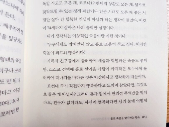 내 주변에도 홀로 사는 사람이 꽤 많고 점점 그 수가 늘어나고 있는 터라, 저자가 활동하는 방식에 많은 관심이 간다. 가족에게 피해를 주거나 힘들게 하지 않고 조용히 떠나는 죽음. 저자는 이러한 죽음이 축복이라고 말한다.