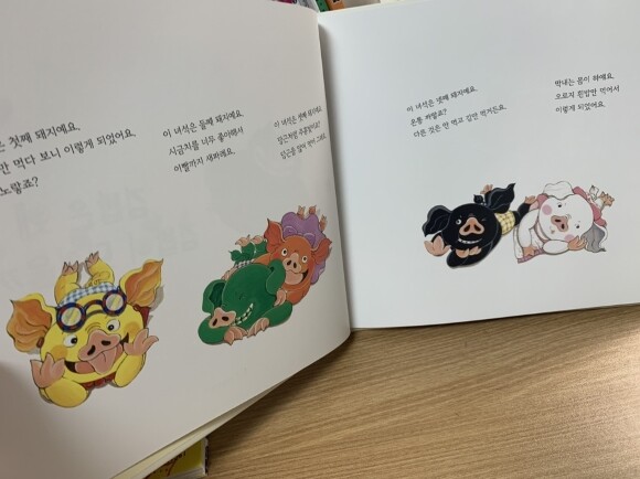다섯 마리 돼지들은 특색도 골고루 각자 좋아하는 것만 먹다보니 이렇게 각자의 색색으로 변했어요. 돼지 엄마의 고민이 이만저만 아닐거 같네요. 거기다가 음식으로 오인해서 잡혀먹을까봐 겁이 나기도 ...
