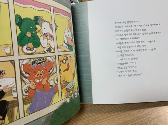 아이들이 재미있게 볼 수 있는 그림책입니다. 김밥그림들을 보니 넘넘 먹고 싶어졌어요. 아기돼지들의 분홍빛의 몸 색깔이 아닌 좋아하는 음식의 색깔이 자기 몸의 색깔을 하고 있는 아기돼지들의 모습들도 신기했어요.