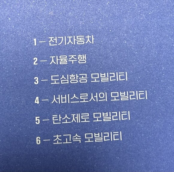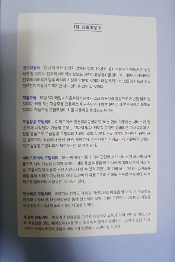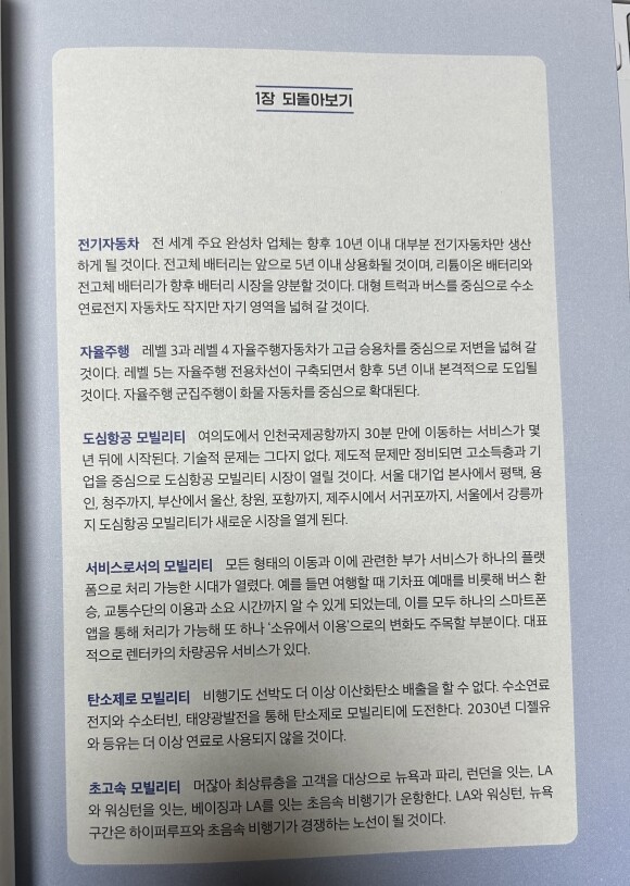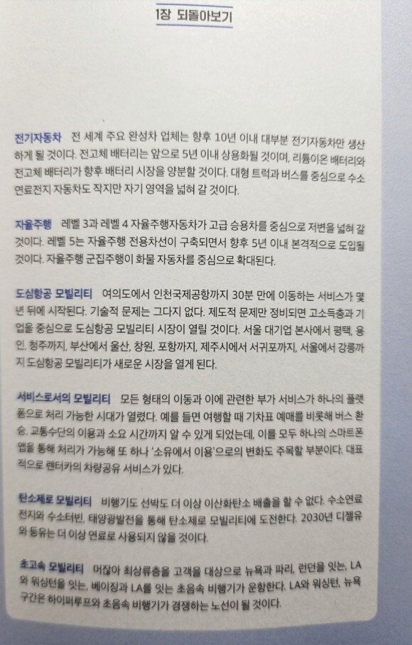 1장 모빌리티 1. 전기자동차 2. 자율주행 3. 도심항공 모빌리티 4. 서비스로서의 모빌리티 5. 탄소 제로 모빌리티 6. 초고속 모빌리티