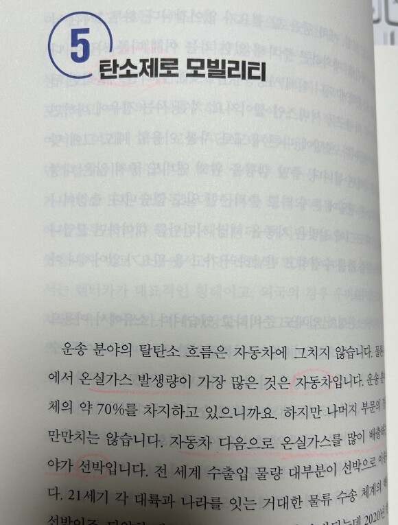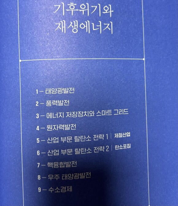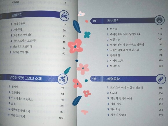 이 책은 총 5장에 나누어 과학과 관련된 이슈들을 다루고 있어요. 제1장에서는 전기자동차, 자율주행 등 모빌리티에 대해 다루고 있어요. 우리의 삶을 완전히 바꿔놓을 것이 예상되는 자율주행의 세계와 수소선박, 수소비행기 등 연료체계의 변화들도 경험할 수 있었어요. 제2장에서는 발사체, 인공위성, 로봇, 생분해성 플라스틱 등 우주와 로봇, 소재에 대해 설명해주죠. 나로호 등 국내 우주기술의 발전을 눈으로 볼 기회가 많아지면서 인공위성 시장이 어떻게 발전하는지도 알 수 있었네요. 제3장에서는 반도체, 양자컴퓨터, 인공지능, 사물인터넷, 블록체인 등 무수히 쏟아져나오는 정보통신에 대한 모든것을 배울 수 있어요. 최근 뉴스에서 반도체에 대한 규제로 국가의 경제규모 변화를 듣고 있어 더 관심이 가는 주제더라구요. 제4장에서는 합성 생물학을 비롯 GMO, 미래식량, 백신 등 생명공학의 다양한 주제들을 다루었어요. 코로나19백신 등 전세계 생존에 미치는 영향 등을 이미 경험한지라 생명공학에 대한 관심이 더 집중될 수밖에 없는 거 같아요. 마지막으로 현대사회에서 빠질 수 없는 기후위기와 재생에너지 주제도 관심있게 바라보았어요. 태양광 발전을 비롯하여, 에너지 저장장치, 탈탄소 전략, 수소 경제 등 아직은 멀지만 우리가 실현해야 할 과제가 무엇인가에 대해서도 배울 수 있는 귀한 시간이었어요.