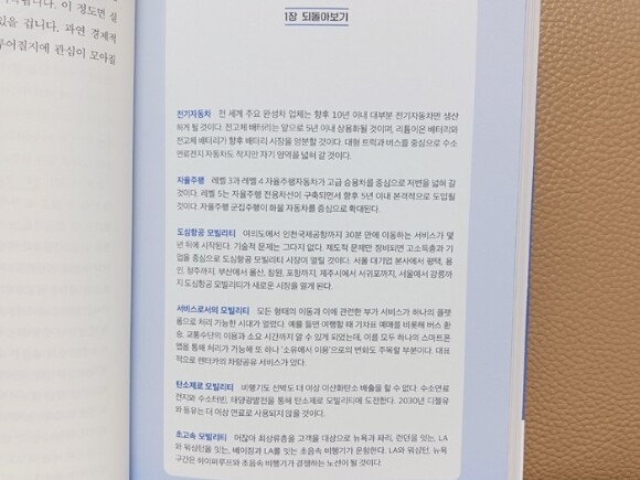 <<내용>> 1. 모빌리티 : 열차에서 내연기관 자동차와 비행기, 선박의 등장으로 전환점이 이뤄졌고, 전기자동차와 수소연료전지 자동차, 수소선박, 수소비행기 등 연료 체계의 변화와 도심항공 모빌리티 등 새로운 모빌리티, 자율주행이 등장했습니다.
