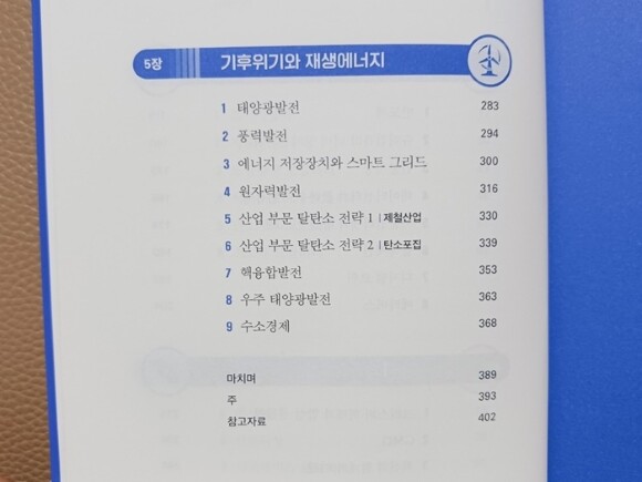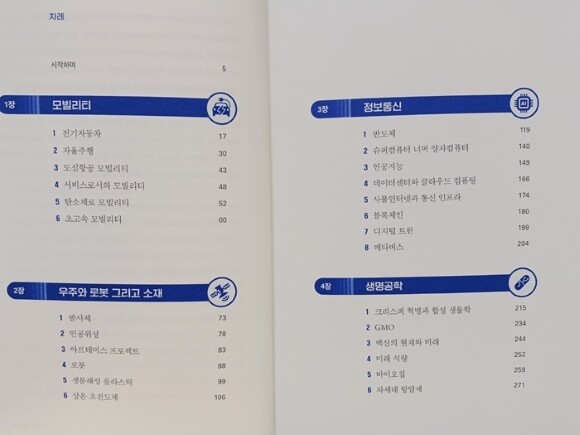과학에 관심이 많은 아이와 함께 보면 좋겠다는 생각이 들어 선택한 책인데, 예상대로 다양한 과학 지식을 담고 있어 매우 유익했고 책을 통해 현재 발전 중인 과학기술들이 미래에 어떤 영향을 미칠지 예측해 봄으로써 아이의 진로 결정에도 도움을 줄 수 있을 것 같아 좋았습니다. 시작하는 말 부분에서 작가는 이 책의 목표를 "현시점에서 우리 사회에서 가장 중요하다고 판단되는 과학기술에 대한 기본적 이해와 더불어 현재의 진행 지점과 과제를 종합적으로 파악함"이라고 명시하는데요, 이 목적에 딱 맞는 내용들이 키워드별로 정리되어 있습니다. 차례를 보면 총 5장에 걸쳐 주제별로 나뉘어 있는데요, 뉴스에서 한번쯤 들어봤지만 잘 알지는 못하던 개념들을 알아볼 수 있어 좋았고, 필요한 부분들을 사전 찾듯 찾아볼 수 있는 점도 좋았습니다.
