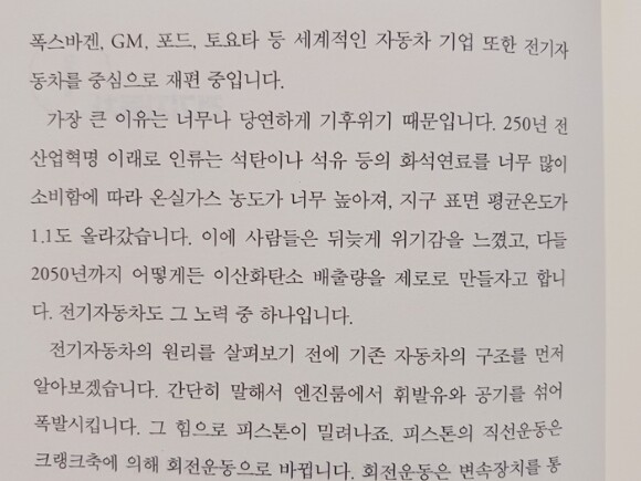 p.18 ... 가장 큰 이유는 너무나 당연하게 기후위기 때문입니다. 250년 전 산업혁명 이래로 인류는 석탄이나 석유 등의 화석연료를 너무 많이 소비함에 따라 온실가스 농도가 너무 높아져, 지구 표면 평균온도가 1.1도 올라갔습니다. 이에 사람들은 뒤늦게 위기감을 느꼈고, 다들 2050년까지 어떻게든 이산화탄소 배출량을 제로로 만들자고 합니다. 전기자동차도 그 노력 중 하나입니다. 화석연료가 부족해서 전기자동차를 개발한것이 아닌 기후위기로 인한 것이란다. 너무 많이 써서 고갈된것이 아니었다. 환경보호 차원에서 다른쪽으로 눈을 돌린것..