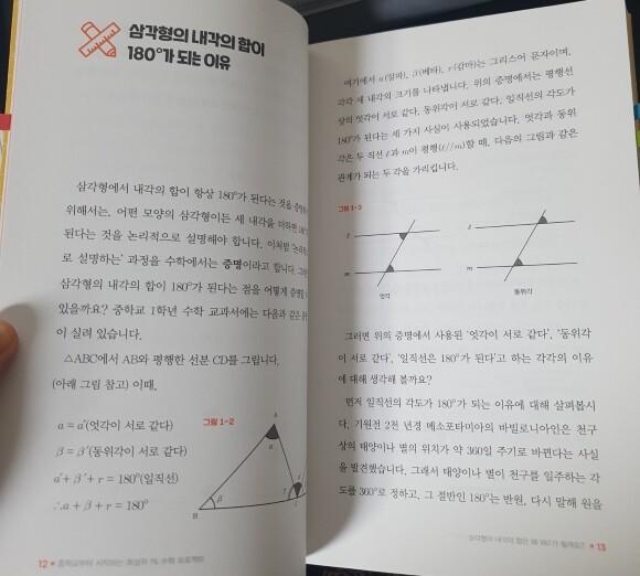 중학교부터 시작하는 최상위 1% 수학 프로젝트 수능 만점을 위한 교실 밖 수학 이야기 사카마 치야키 지음 김지예 옮김 정동은 감수 동아엠앤비 문해력이 없으면 국어가 서툴고 단어를 모르면 영어가 어렵고 수학을 잘하려면 개념 정립이 필요충분조건이라고 해요.. 1장 삼각형의 내각의 합은 왜 180도 가 될까요? 2장 피타고라스의 정리에 대해 살펴봅시다. 3장 왜 0 으로 나누면 안 되는 걸까요? 4장 음수× 음수는 왜 양수가 될까요? 5장 원주율은 왜 일정한 값일까요? 6장 무리수는 어떻게 무한소수가 되는 걸까요? 7장 루트 2 가 무리수라는 사실은 어떻게 알수 있을까요? 8장 유리수의 개수가 많을까요.무리수의 개수가 많을까요? 이렇게 8장으로 구성되어 있는 책입니다. 수학의 공식 단순 암기가 아니라 그 공식이 될수밖에 없는..이렇기 때문에 이 공식이 탄생한 배경을 알려줍니다. 하나의 예로 Ex> 삼각형 내부의 세각의 각을 내각 이라고 합니다. 삼각형 세 내각을 합하면 180도가 된다는 사실 그렇게 되는 이유를 실제로 알아보는 예시가 수록되어 있어서 이해하기가 좋았어요. 초등학생 중 중학수학을 선행한 친구들이라면 이 책을 읽어볼수 있지만 그렇지 않은경우 이 책은 읽기 어려울것 같아요.. 어른들 같은 경우 수포자였어도 한번쯤 들어본 수학내용이라 읽기에는 어려움은 없지만 아무래도 지식책은 유머.즐거움과는 상반되는 책이니 재미로 읽는 책은 아니에요.. 수학의 즐거움이 있는 분들은 신기하고 자세한 설명에 즐거움이 .. 재미까지 겸비할테지만요