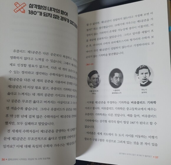 어른이 되어 하는 수학 공부는 한결 가볍고 편하다. 그리고 모르는 문제를 계속 껴안고 생각해 볼 수 있는 시간적인 여유까지 있다. 학교 다닐 땐 그저 교과서에 나온 내용이니 당연히 받아들였던 것들에도 왜? 하는 의문을 가질 여유도 생겼다. 이 책은 이런 나에게 몹시 고마운 책이다. "삼각형의 내각의 합은 180도이다."같은 당연한-학교에서 그렇게 배웠으니까-것에도 의문을 제기하고 답을 찾아나간다. 물론 그 과정이 마냥 쉽지는 않다. 복잡해 보이는 수식들을 꼼꼼히 살피고 따라가야 하니 말이다. 그래도 그 끝에 가서는 아~하고 무릎을 탁 치게 한다. 이 책이 품고 있는 가장 큰 뜻은 아마도 이것이 아닐까 한다.