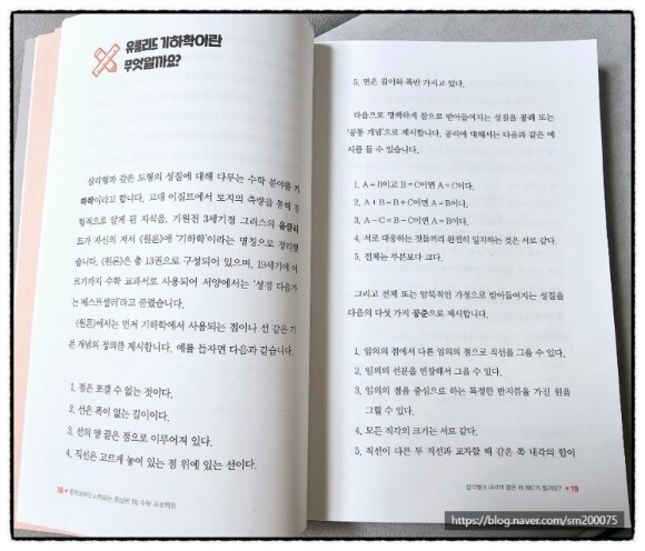 학창시절 나는 수포자는 아니었다. 한문제 풀었을때의 그 기분이 너무 좋았다. 수학이 좋다고 해서 성적도 좋은건 아니다.. 수학성적은 내 기분을 항상 다운시키는데 한 몫을 했다. 이번에 알게된 '최상위 1% 수학 프로젝트' 도서는 중학교부터 배우는 수학의 기본 이론들에 대해서 재미있으면서 알기쉽게 설명되어 있다. 어떤분은 수학 역시 암기라고도 하고 이해과목이라고도 하는데 수학은 원리를 이해하면 훨씬 쉬워짐은 맞는 말 같다. 이 책에서는 이론에 대한 정의와 이유들 반드시 그렇지 않는 경우들과 알아두면 도움이 되는 배경지식들 까지 모두 소개가 되어져있어서 중학생을 시작하는 아이와 시작한 아이들에게 유익한 도서가 될 듯하다. '최상위 1% 수학 프로젝트'는 총 8장으로 구성되어져있고 각 장의 큰제목은 호기심을 자극하는 질문들고 시작이 된다. 1장 삼각형의 내각의 합은 왜 180°일까? 2장 피타고라스의 정리에 대해 살펴봅시다. 3장 왜 0으로 나누면 안 되는 걸까요? 4장 음수*음수는 왜 양수가 될까요? 5장 원주율은 왜 일정한 값일까요? 6장 무리수는 어떻게 무한소수가 되는 것일까요? 7장 루트2가 무리수라는 사실은 어떻게 알 수 있을까? 8장 유리수의 개수가 많을까요? 무리수의 개수가 많을까요? 로 구성되며 그 속에는 더 재미있는 설명과 이유와 사연들이 담겨져있다.
