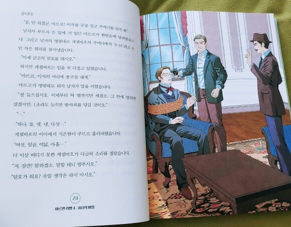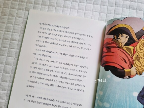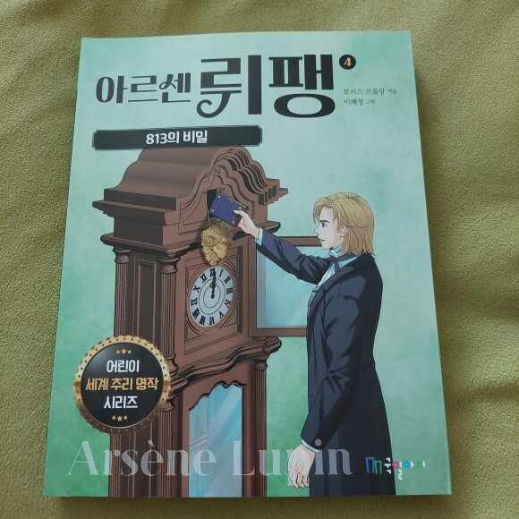 요새 유행하는 웹소설 책표지처럼 주인공이 딱! 그려져 있어요. 너무 책표지에서 내용 스포를.... ㅋㅋ 813, 시계에서 무언가를 꺼내는 뤼팽. 음 시계를 8시 13분으로 설정해서 뭔가를 꺼내를 설정!? 추리를 한번 해봤습니다.