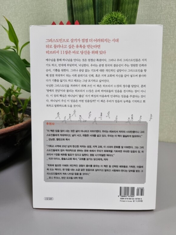 그리스도인이라면 가장 많이 말하고 기도하고 필요하다고 생각하는 것 중의 하나가 바로 "믿음"이라는 단어일 것이다. 어느 한 조사에 따르면 성경에 가장 많이 나오는 단어가 죽음. 그다음은 사랑 그리고 세 번째가 "믿음"이라고 한다. 그 숫자가 무려 약 250번가량이다. 그만큼 성경은 믿음에 대해서 말하고 그리스도인의 신앙생활에서 믿음은 빼놓을 수 없는 아주 큰 의미를 지니고 있다. 성경의 많은 부분이 믿음을 이야기하고 있지만 그중에서 믿음에 관한 장을 하나 뽑으라고 하면 누구나 쉽게 말하는 것이 아마도 소위 믿음의 장이라고 불리는 히브리서 11장 일 것이다. 이 책은 그 히브리서 11장에 대한 내용이다. 책 표지의 아랫글에는 "믿음으로 달리고, 달리고, 달리다 지쳐서 이제는 포기하고 싶은 당신에게 히브리서 11장이 전하는 11가지 정직한 격려"라고 이야기한다. 그리고 이 책에 특별히 인상적인 부분은 책표지의 그림이다. 히브리서 11장을 그림으로 나타낸다면 바로 이런 그림이 아닐까 한다. 많은 사람들이 한 곳의 푯대를 향하여 달리고 있다. 모두 달리고 있다는 것이 인상적이다. 이 많은 사람들 중에 나도 역시 참가해서 달리고 있다는 생각을 해보았다. 처음에 예수님을 믿지 않을 때는 아직 달리기 출발선에 서지도 못한 상태이고 한 사람이 예수님을 믿음 그 순간부터 믿음의 경주라고 하는 달리기의 출발선에 서서 달리는 것이다. 바로 주님 오실 때까지 달리는 것이다. 출발의 시간이 다르듯이 누가 가장 먼저 1등으로 달리는지도 중요하지만 그것보다 중요한 것은 바로 끝까지 달리는 것이다. 우리의 신앙생활도 달리다 보면 지칠 때가 있다. 그러나 그대로 포기하지 않고 다시 회복하여 숨을 고르고 달리면 되는 것이다. 초대교회 시대 때 유대인 중에 예수님을 믿고 그리스도인이 된 유대인 그리스도인들이 신앙생활을 하다가 여러 가지 압박으로 인해 다시 힘을 잃고 낙심한 그들을 위해서 쓰인 것이 히브리서이다. 그리고 11장은 그들이 다시 회복하여 믿음의 경주를 지속할 수 있도록 구약시대의 믿음의 선진들의 믿음의 선례를 이야기하며 다시 믿음을 회복시키기 위하여 독려하고 있다. ?알다시피 2년간의 코로나19로 인해서 사회의 여러 가지 변화가 많았지만 영적으로 보았을 때 많은 사람들이 신앙을 멀리하고 타협함으로 인해서 믿음을 잃어버린 사람들이 많다. 나 또한 주님을 향한 열정이 식고 예배와 기도 말씀 일기가 형식적으로 흘러감을 느끼고 있다. 이런 시대를 맞아 그리스도인들에게 우리가 가야 할 푯대를 보게 하고 믿음의 경주를 시작할 수 있도록 함에 이 책이 시의적절한 책으로 느껴진다. ?이 책의 차례는 보는 것만으로 우리가 어떤 것을 회복해야 하는지 보여준다. 확신하다. 인정받다. 순종하다. 인내하다. 희생하다. 열망하다. 담대하다. 자기를 부인하다. 능력을 입다. 견디다. 예수님 안에서 온전해지다. 이 모든 것들이 바로 내가 서야 할 자리이며 회복해야 할 자리이다. ?이 책의 저자는 리처드 코킨 목사님이시다. 이분은 현재 영국에서 가장 영향력 있는 다섯 명의 복음주의 지도자 중 한 사람이다. 특히 저술가로서 뛰어난 학식을 지녔음에도 어려운 말과 어려운 지식을 피하며 모든 연령층이 이해하기 쉽게 설명하는 친근한 설교자로 정평이 나있다. 그래서 그런지 설명하기 어려운 부분도 쉽게 설명하여서 책을 읽어나가는데 어려움이 없었다. 책의 내용 중에서 가장 되새기게 된 것은 바로 하나님이 약속하신 미래에 대한 견고한 확신이라는 문구였다. 믿음이 있기 위해서는 그 사실에 대한 확신이 있어야 한다. 보통 하나님이 말씀하시는 믿음은 눈에 보이지 않는다. 따라서 그것을 믿기 위해서는 하나님이 말씀하셨다는 약속을 견고하게 확신해야 한다. 책을 읽으며 나는 하나님의 말씀을 확신하는가를 돌아보게 되었다. 벌써 교회를 다닌 지 수십 년이 되고 신앙생활을 한지는 10년도 넘었지만 이 질문 앞에 당당히 대답하지 못하는 나를 보게 되었다. 그리고 하나님의 말씀에 확신하는 것이 얼마나 중요한지를 깊게 생각하게 되었다. 히브리서 11장에는 여러 믿음의 선진들이 등장한다. 이들이 모두 보이지 않지만 보이는 것처럼 달려갈 수 있었던 것은 하나님이 약속하신 미래에 대한 견고한 확신이 있었기 때문이다. 이 책은 코로나로 인해 믿음을 잃어버린 그리스도인, 그리고 신앙생활을 열심히 하다가 가나안 성도가 되어버린 그들에게 추천하고 싶다. 이 책을 덮으며 내가 주님 오실 날까지 가야 할 푯대를 다시 기억하고 피곤한 손과 연약한 무릎을 일으켜 세우고 믿음의 경주에 기쁨으로 참여하기를 결단한다.
