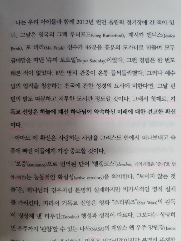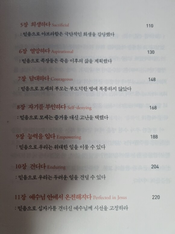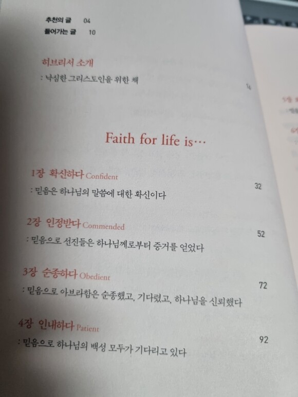 처음 독특한 표지를 보고서 무엇을 말하는지 예상이 되지 않았다. 물론 책을 읽어나가면서 무엇을 말하고 싶어하고, 어떤 영향을 주고 싶어하는 책임을 충분히, 확실히 느끼게 되었다. 과거 한 대학생연합수련회에서 예수 믿는 젊은이들이 책을 읽어야 한다고 외치셨던 김남준 목사님의 추천의 글도 인상적이었다. 히브리서를 한폭의 그림처럼 생생하게 펼쳐 보여주는 귀한 책이라 생각되었고, 김남준 목사님 말씀과 다름이 없었다. 요즘 무엇을 신앙하는가에 대한 고민을 안고 있었다. 살아온 날동안 예수를 믿고 교회 생활을 한 것은 맞는데, 부흥회나 좋은 책을 읽고, 목사님의 매주 주시는 말씀으로 은혜가 되는 것 같은데, 왠지 방향을 잃은 기분이었다고 생각했다. 책에는 챕터별로 붉은색 삽입지가 있고, 삽입지에는 히브리서 말씀으로 시작하고 있는데, 그 삽입지를 만나면 각 장이 어떻게 진행될까 궁금해졌다. 뭔가 설계된 도면을 보는 것 같고, 히브리서를 분해해놓은 것 같기도 하고, 잘 다듬어 정리해놓은 것 같아서 흥미진진했다. 다 읽고나서는 그리스도인의 삶은 마라톤과 무척이나 닯아 있다는 걸 다시 확인했다. 달리다가 속도를 더 빠르게 하거나, 늦추거나 할 수도 있고, 때론 돌뿌리에 걸려 넘어지기도 하지만, 툴툴 털고 일어나 다시 결승점을 향해 이전과 같이 달리는 것처럼 그리스도인의 삶도 마찬가지구나 생각했다. 부모님께서도 조금 앞서 달리고 계시고, 여러 신앙의 선배들도, 동료들도, 또 자녀를 비롯한 후배들도 달리고 있구나 생각되니, 그동안 혼자 고민하고, 안타까워하고, 불안해하고, 아쉬워하던 부분들이, 심각해보였던 점들이 어쩌면 별 것 아닌 것일 수 있겠구나 느껴졌다. 마지막 '11장 예수님 안에서 온전해지다'를 읽으면서 최근 갖고 있던 고민의 답을 찾았다. 예수 그리스도를 바라보아야 했는데, 아마도 사람들을 본 것이 걸림돌이 되지 않았나 하는 생각이 들었다. 아마도 갖고 있던 무거운 것을 벗어 버리지 못한 거라 생각되었고, 짐을 들고 달리고 있었던 것이다. 죄를 벗어버리지 못하고 있었던 것이다. 예수를 바라보고 달리면 된다는 걸 잊고 살았다. 책을 통해 다시 알게 된 나에게 주어진 축복을 잊고 살았던 것이 안타깝게 생각되었고, 예수님을 바라보고 달리는 것이 내가 할 수 있는 것이라 생각된다. 흔들림 없이 예수님 안에서, 예수님을 바라보고, 믿음으로 살자!