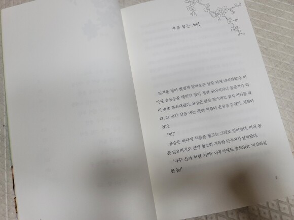 주인공 윤승은 평안도 안주에서 어머니와 누나의 바느질 일을 도우며 살던 열다섯 살 소년이예요. 병자호란으로 가족과 이별을 하고 홀로 청나라에 노예로 끌려와 학대를 당하며 일을 하고 있는 장면으로 이야기는 시작되요. 윤승이 머무는 집은 심양의 큰 상인인 강 대인의 집이예요. 강 대인 집 노예로 고통스런 나날을 보내던 중 우연히도 강 대인의 두번째 부인인 진씨를 알게되요. 남자이지만 자수 솜씨가 남다르다는 것을 알게된 진씨 부인은 윤승에게 일을 부탁하지만 다른 사람의 계략에 의해 노예시장으로 내몰리게 되요. 책의 전반부에서부터 이렇게 우여곡절이 많아서 쉽게 몰입할 수 있었고 수를 놓는 '소년'이라는 인물이 흥미롭게 느껴졌어요. 또 아름답다고 느꼈을뿐 자수에 대해서는 잘 몰랐었는데 이야기 속에서 자연스럽게 전통 자수에 대해 알 수 있어서 좋았어요.