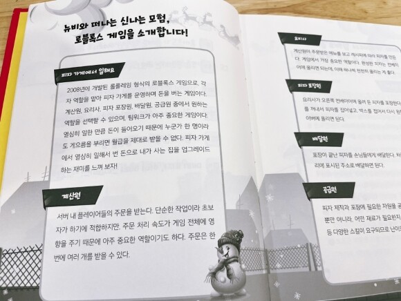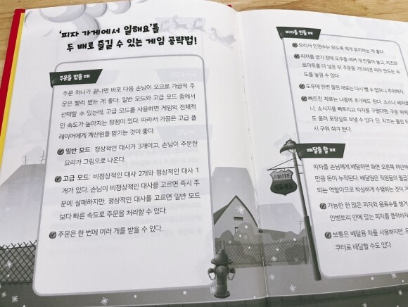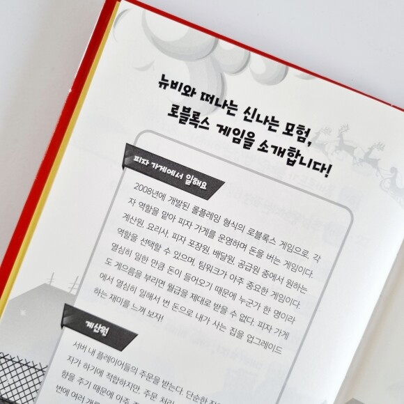 책의 시작 전에 책에 등장하는 로블록스 게임 ‘피자 가게에서 일해요’을 소개하고, 공략법도 나오네요. 로블록스 게임에서 책으로 아이들의 흥미를 끌어올 수 있겠네요.