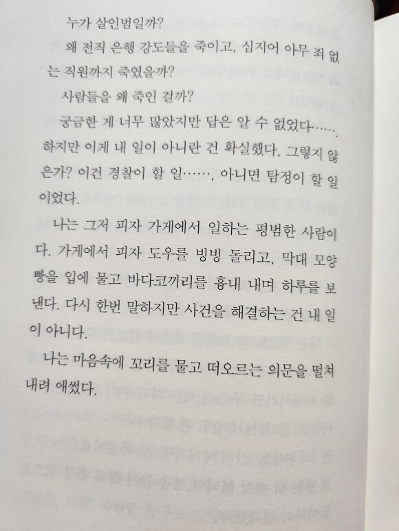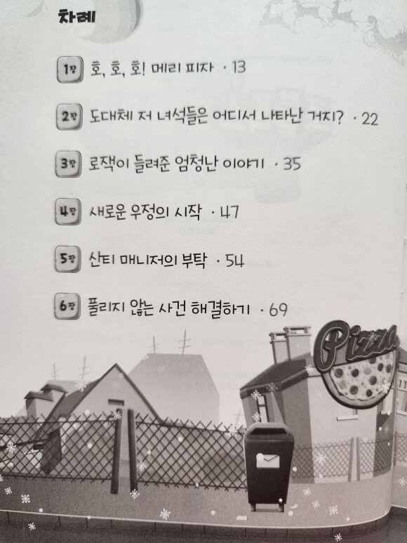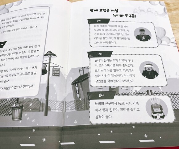 책의 내용은 이래요~ [피자가게에서 일하기] 서버에서 일어나는 일입니다. 평화로운 피자가게에, 새로운 동료 5명이 들어오게 되면서 사건이 일어나죠. 바로 '살인사건' 후덜덜덜.. 주인공 "뉴비"가 사건을 해결해보려고 해요. 크리스마스가 오기전에요. 뉴비가 만나느 사람들, 그리고 그 안에서 얻게되는 단서들. 그리고 마침내 찾아내는 범인 !! ^^ ㅋ 어린이 도서인데 어른이 봐도 너무 재미있어더라구요. 초등 저학년 친구들이 읽기에 글밥이 많은 것도 아니고. 너무 좋았어요!