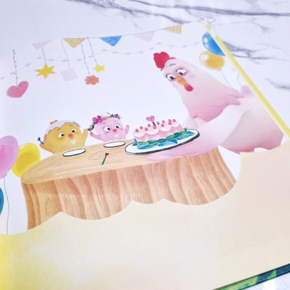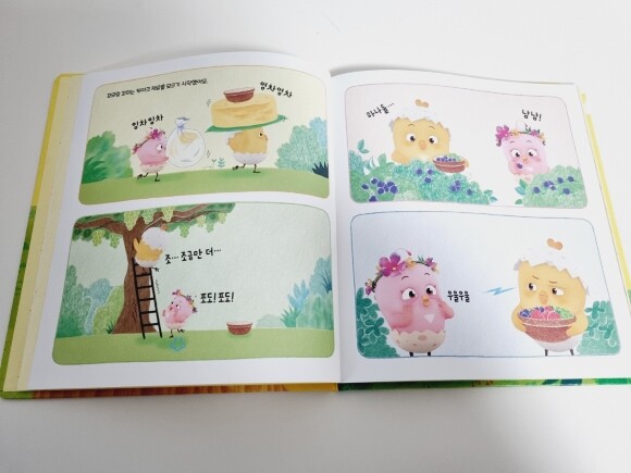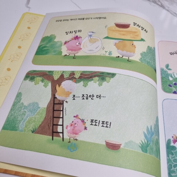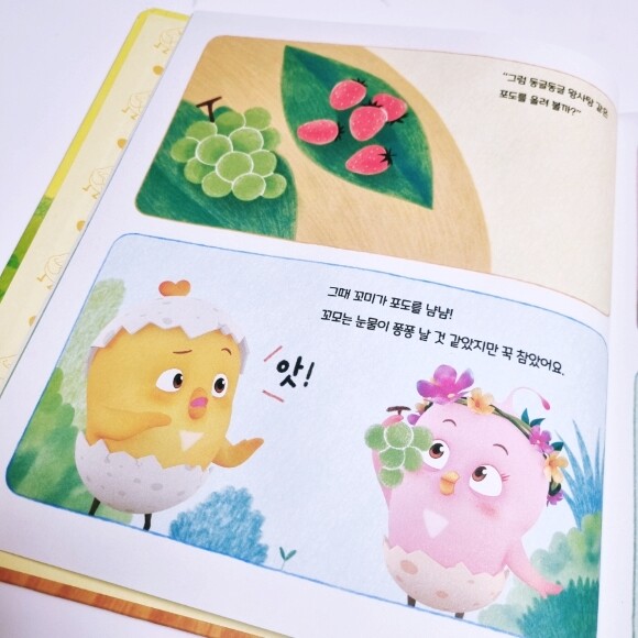어느 푸르른 숲속에서 노란 병아리 꼬모와 분홍 병아리 꼬미가 케이크 재료를 열심히 모으고 있어요. 자그마한 손으로 탐스럽게 익은 포도도 따고, 딸기도 따고, 블루베리도 준비하며 바구니를 한가득 채운 꼬모와 꼬미. 그런데 바구니 드는 것부터 시작해서 케이크 만들기까지~ 누가 남매 아니랄까봐 엄청 티격태격 싸우기 시작해요.