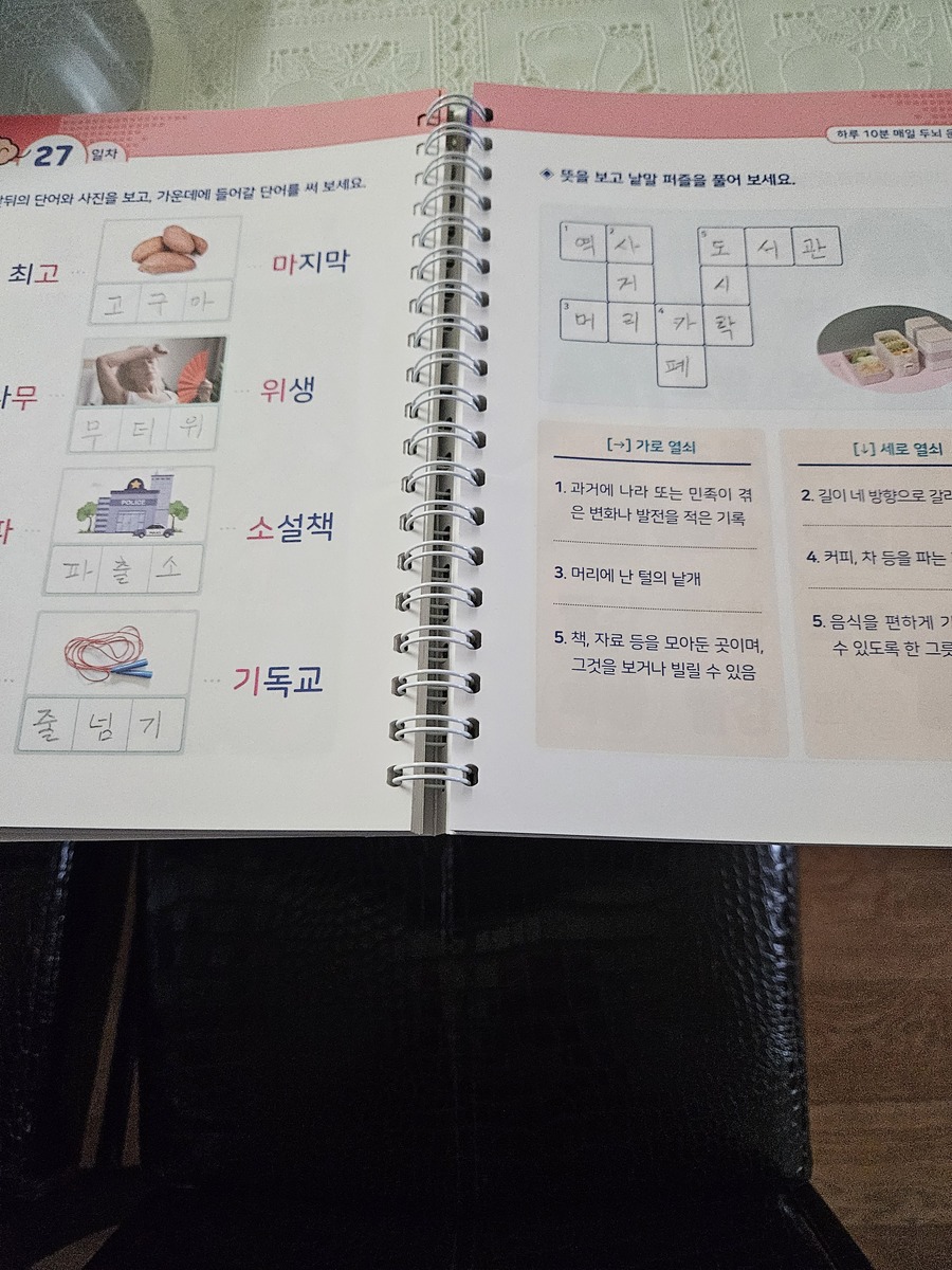어머니와 같이 인지 공부하려고 구매하게 되었습니다 편하게 볼수 있는 그림과 생각보다 간단하고 쉬워서 금방 풀수 있었고 재밌게 했던거 같습니다 무엇보다 글씨도 크고 두꺼운데도 불구하고 너무 잘되있어서 하루하루 하면서 간단하게 할수 있었던거 같습니다 |