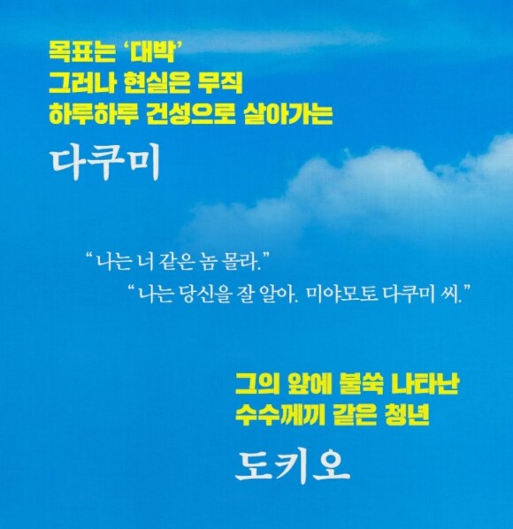 어째서 '도키오'는 타임슬립을 하게 되었을까? 자기 또래의 아버지 '다쿠미'를 찾아간 '도키오'는 독자들에게 어떤 이야기를 들려주게 될까? 472P나 되는 적지 않은 분량이였지만 단숨에 정말로 순식간에 읽어버렸다. 이야기의 흡입력이 대단하다고 해야할까? 내가 별로 좋아하지 않은 '새드엔딩'이었지만, 눈물은 나지 않았다. '작은 여운' 정도가 남은 것 같다.