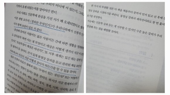이러한 저자의 강좌를 시청 방법은 우리가 책을 읽다가 그만두는 우를 범하지 않도록 해준다. 그래서 어떠한 마음으로 시작을 하고 배워나가는 지가 더 중요하며, 그 과정 역시 중요하다는 것을 말하고 있다. 하지만, 저자의 추천하는대로 인문학 전반에 대한 관심이 없다면 사실 쉬운 문제가 아니다. 그렇다면, 차라리 자신이 관심이 있는 강좌부터 살펴보는 것이 더 좋은 방법이 될 것이다. 저자가 말하는 방식대로 이 책에 소개된 동영상 강좌들을 차근차근 공부해 나간다면 더 좋은 결과를 얻을 수 있다.